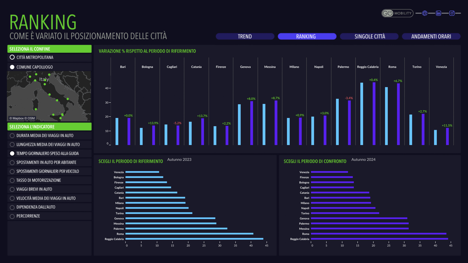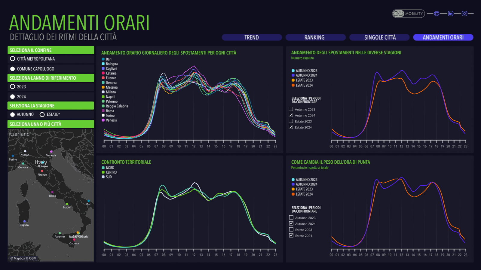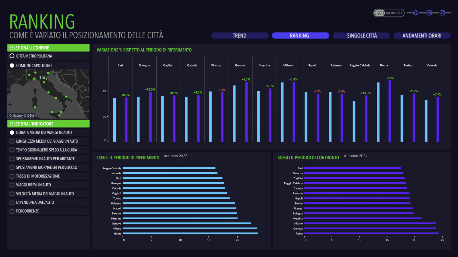 L’Osservatorio sulla mobilità urbana sostenibile monitora la situazione della mobilità nei 14 comuni capoluogo di città metropolitana (Bari, Bologna, Cagliari, Catania, Firenze, Genova, Messina, Milano, Napoli, Palermo, Reggio Calabria, Roma, Torino e Venezia) e nelle nove città (Bergamo, Bologna, Firenze, Milano, Padova, Parma, Prato, Roma e Torino) che partecipano alla “Missione: 100 città climaticamente neutre e intelligenti entro il 2030” della Commissione Europea.