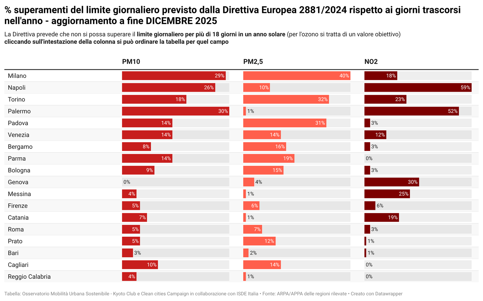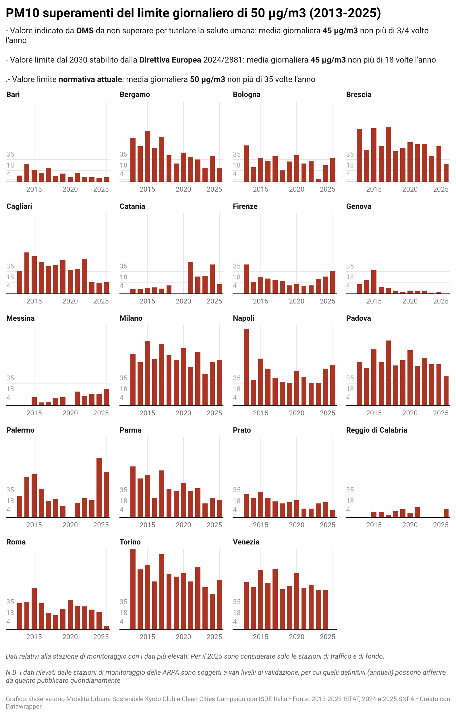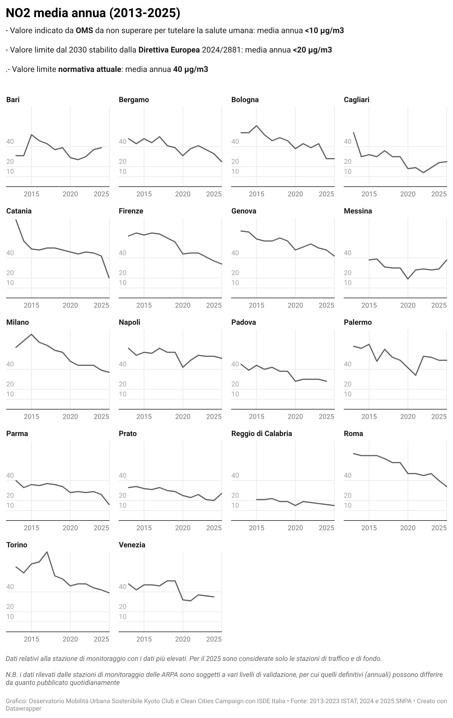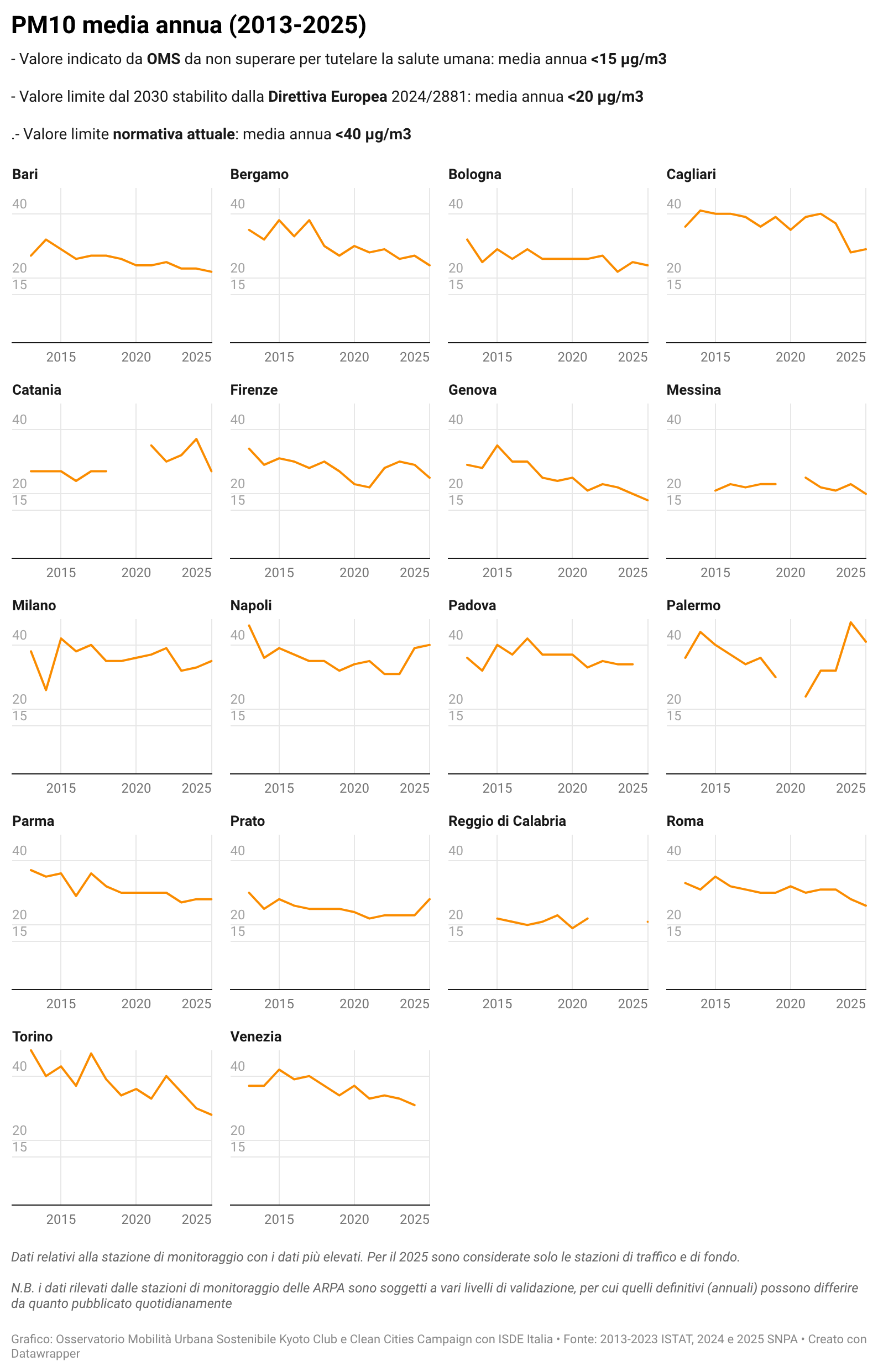 Per alcuni temi specifici sono riportati anche i dati più recenti resi disponibili da fonti attendibili quali l’Osservatorio Nazionale sulla Sharing Mobility, ISFORT, ecc. ovvero elaborazioni a cura dell’Istituto Inquinamento Atmosferico del CNR (IIA-CNR) sulla qualità dell’aria e di Kyoto Club sui PUMS e sul divario delle città rispetto ad obiettivi di mobilità sostenibile al 2030.