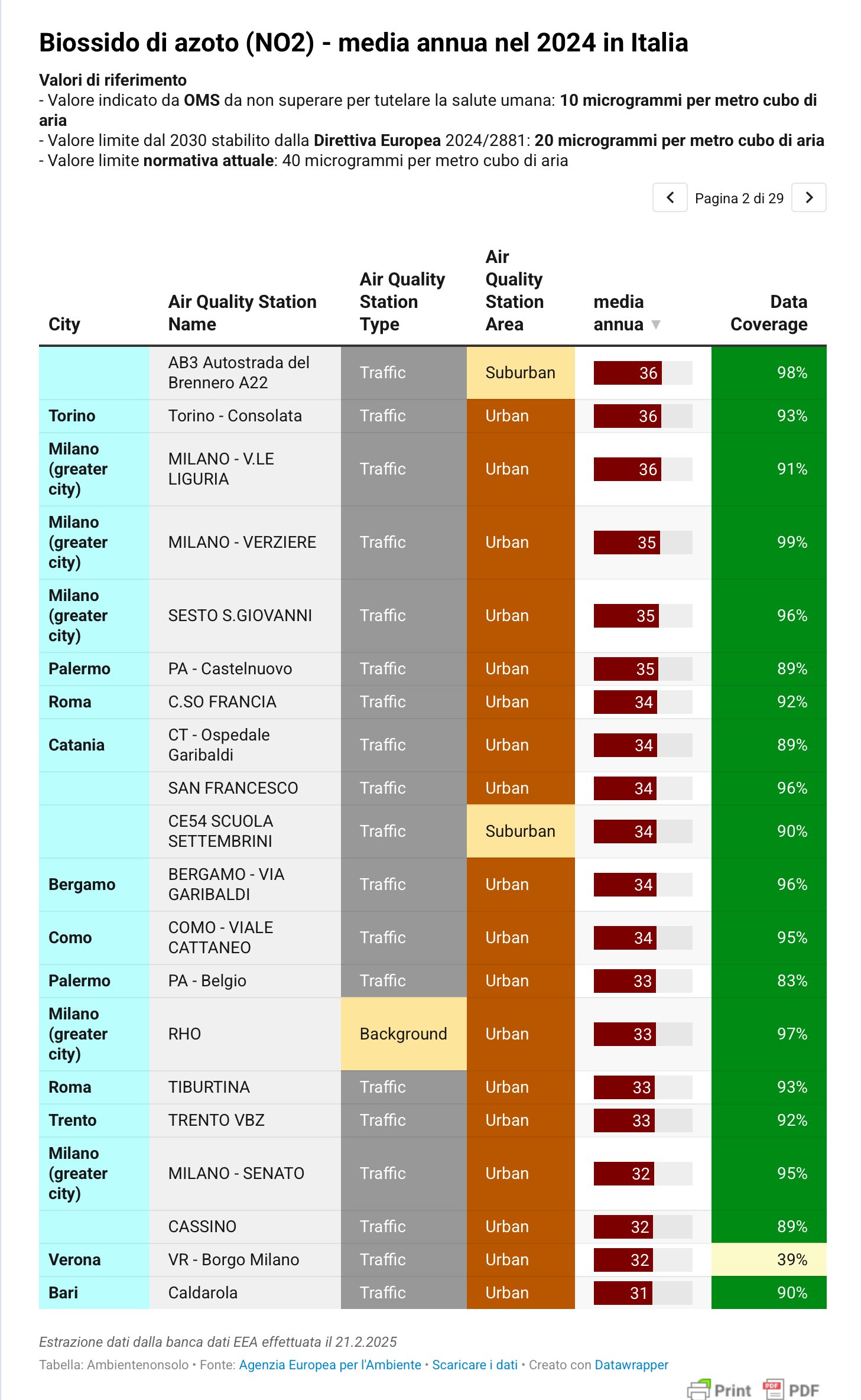 L’Agenzia Europea per l’Ambiente (EEA) mette a disposizione di tutti la banca dati dei risultati che ogni nazione trasmette relativamente ai risultati del monitoraggio della qualità dell’aria.