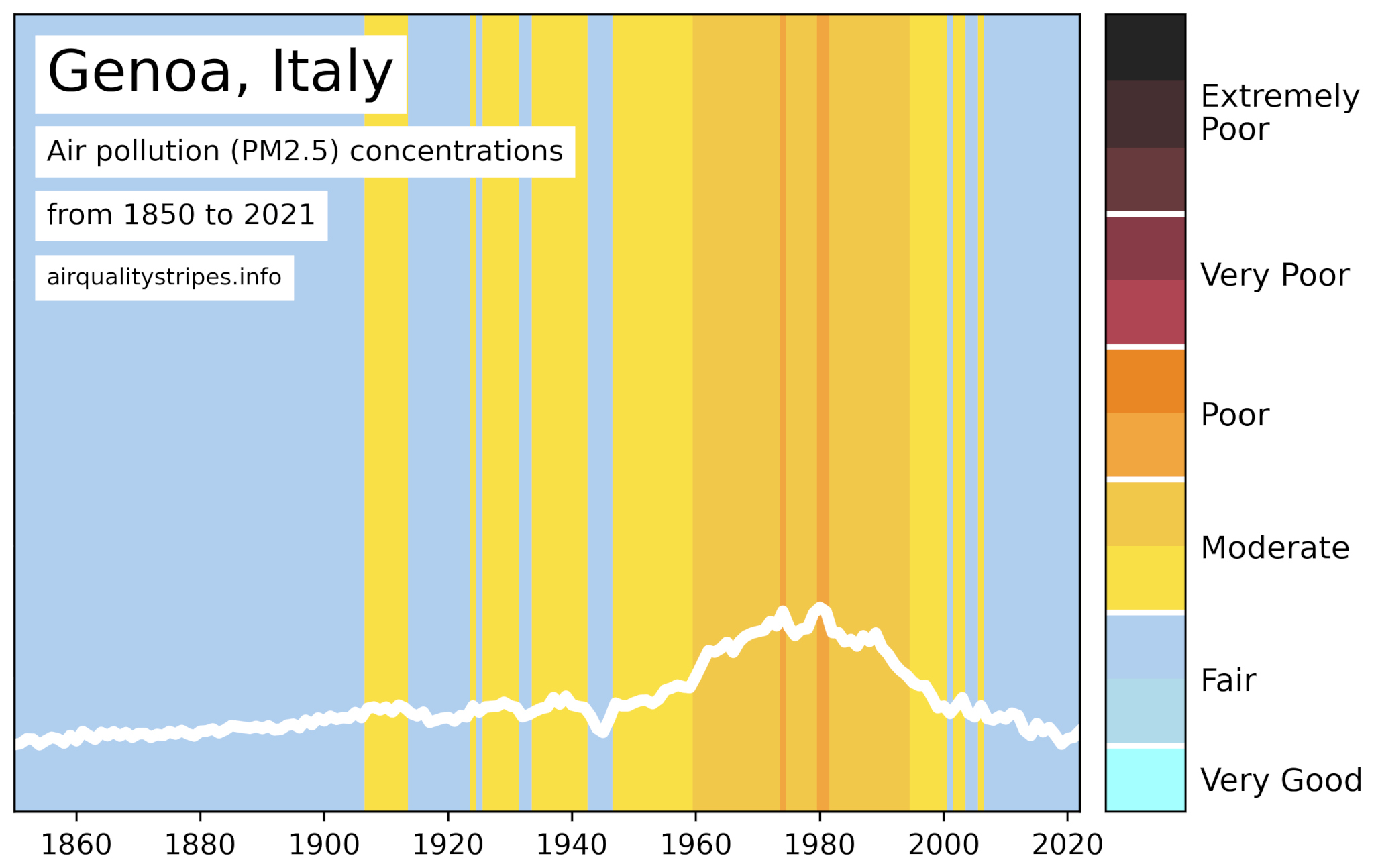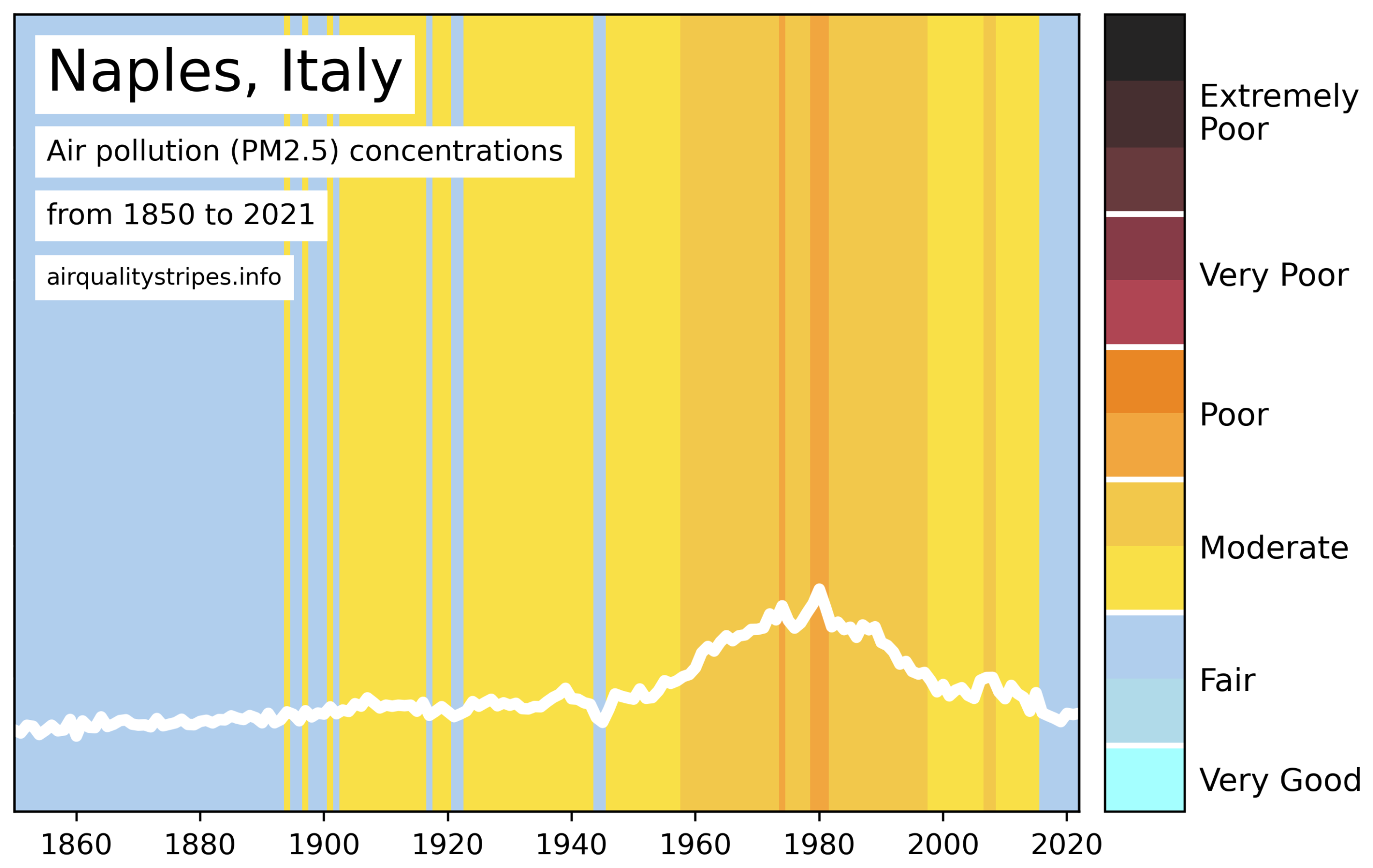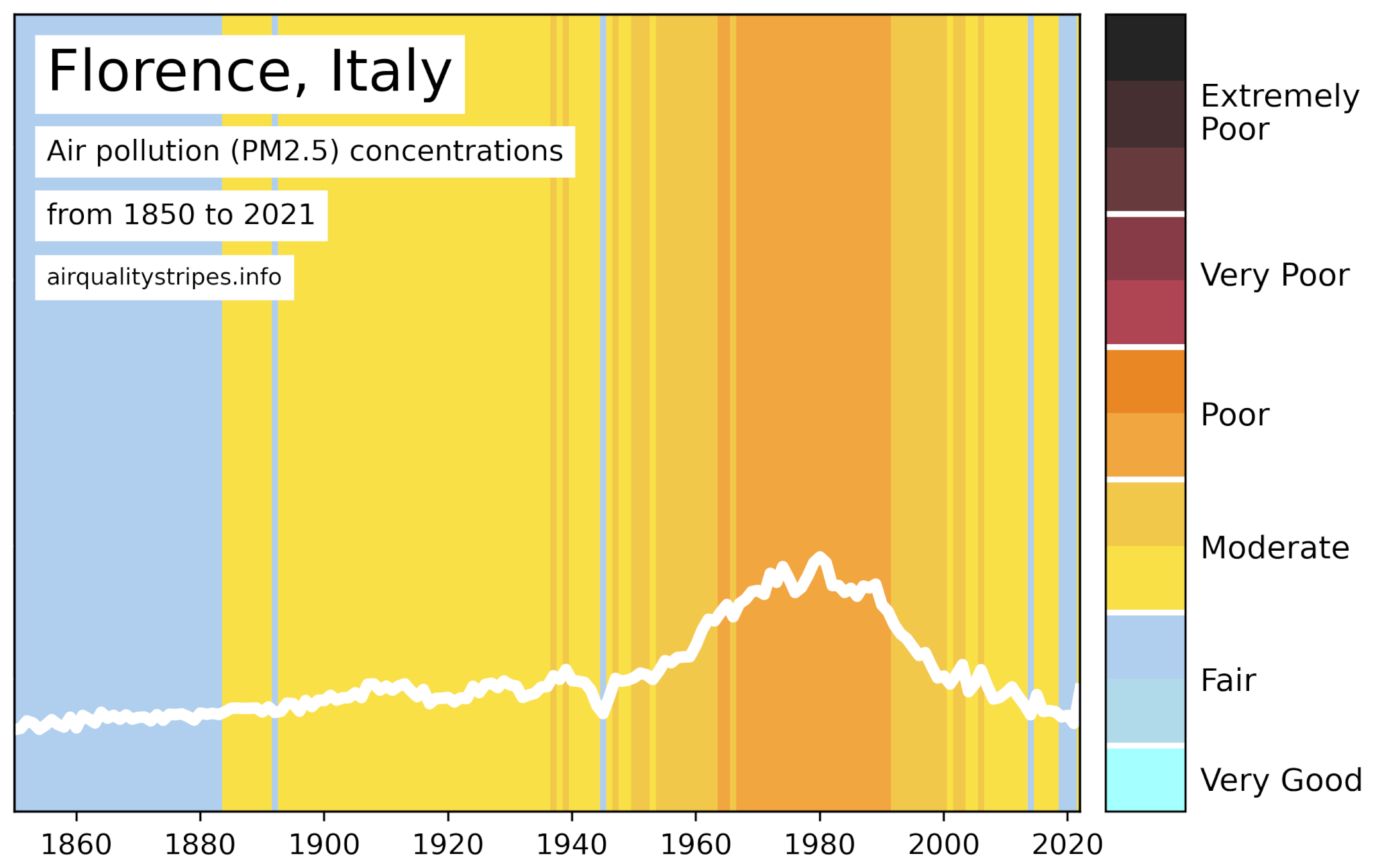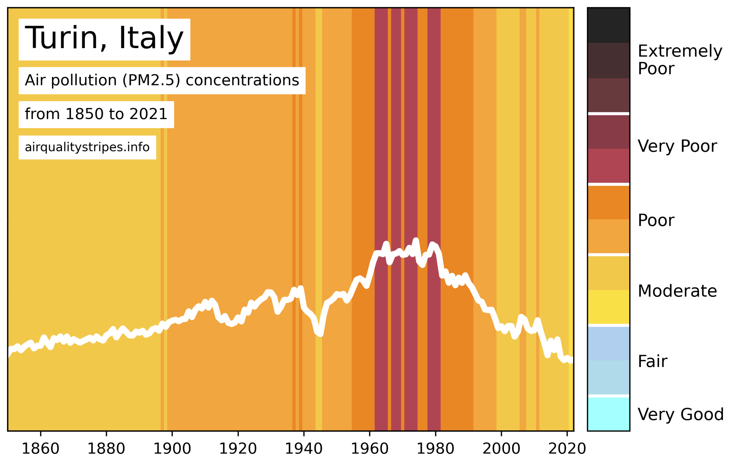 Le strisce della qualità dell’aria mostrano il cambiamento dell’inquinamento atmosferico da particolato (PM2.5) dal 1850 al 2021 in 176 città di tutto il mondo. Fra queste otto italiane, sette delle quali sono fra quelle che monitoriamo come Osservatorio sulla Mobilità Urbana Sostenibile.