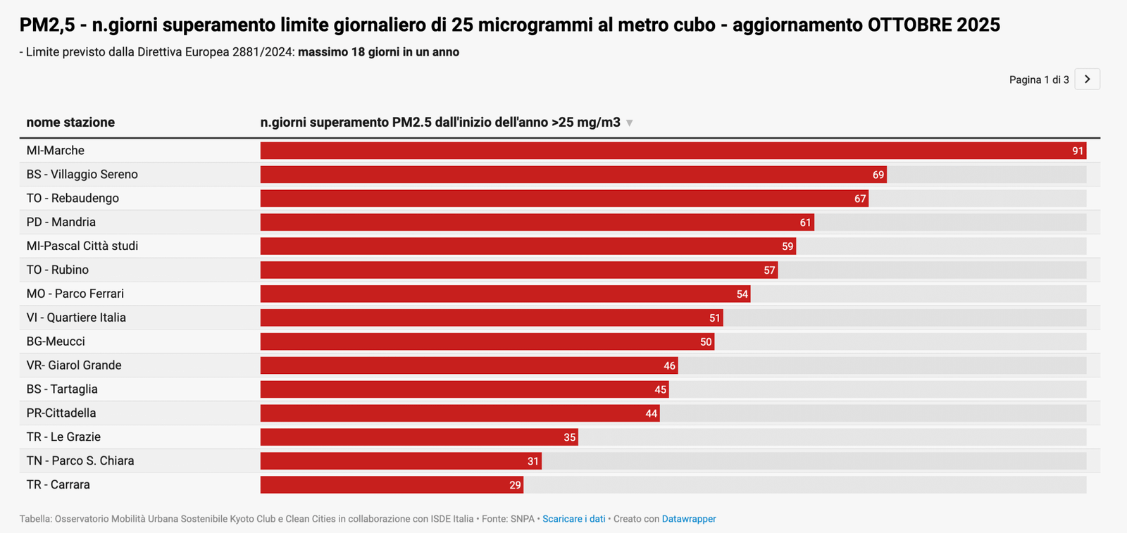 Ancora più grave la situazione relativa al PM2,5, le particelle più fini e dannose per la salute umana. In tutte le città la media annuale supera le soglie OMS e nel 90% delle stazioni anche i limiti della Direttiva europea. I superamenti dei limiti giornalieri (non ancora recepiti dalla normativa vigente) evidenziano una condizione di rischio diffuso: 22 stazioni oltre i limiti europei e 39 oltre i valori OMS. Le città più critiche risultano Milano, Brescia, Torino, Modena e Vicenza, con punte di 91, 69, 67, 54 e 51 giorni di superamento rispettivamente, a fronte dei 18 massimi consentiti.