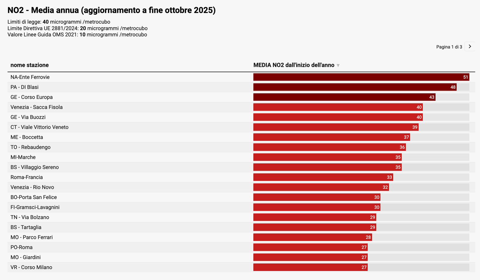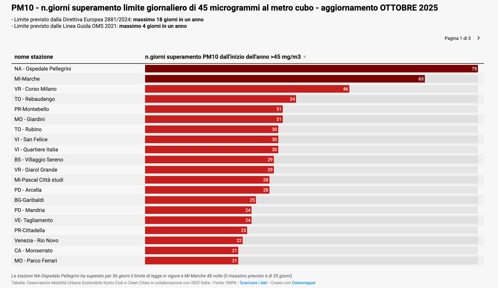 Per quanto riguarda il PM10, la media annuale progressiva a fine ottobre indica che su 57 stazioni analizzate, 56 hanno già superato il valore OMS e 44 anche quello europeo. Due stazioni – Napoli Ospedale Pellegrini (56 giorni oltre soglia) e Milano Marche (48) – hanno infranto persino i limiti di legge ancora in vigore. Se si considerano i limiti introdotti dalla nuova Direttiva europea, le stazioni “fuorilegge” salgono a 25, e diventano 49 quelle che superano i livelli di sicurezza fissati dall’OMS: in pratica, 16 città su 27 risultano non conformi agli standard europei.