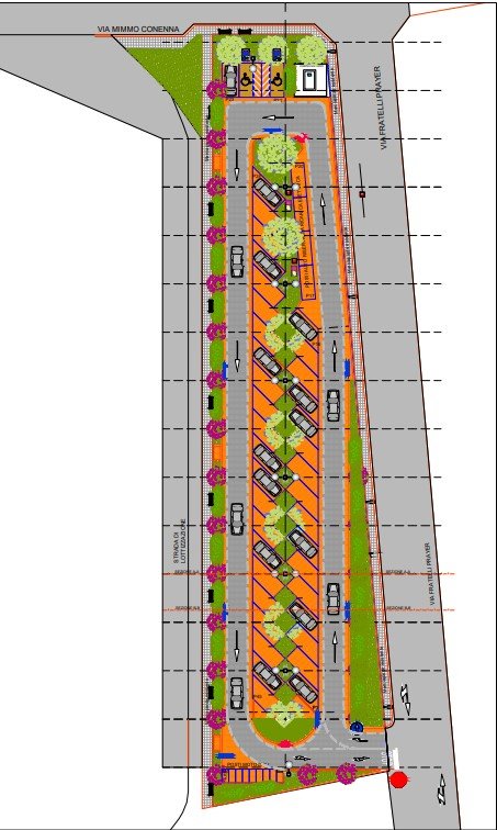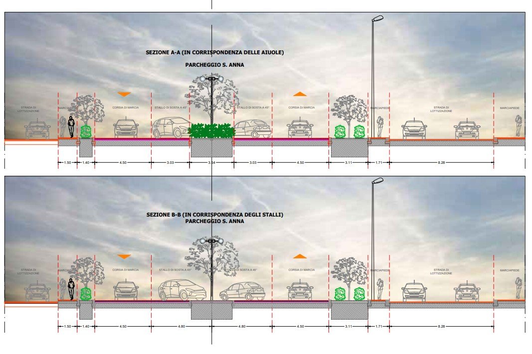 Gli stalli saranno realizzati con una pavimentazione in mattoni autobloccanti, posati su idoneo letto di sabbia fine, per favorire la permeabilità dell’area: la superficie sarà totalmente drenante e saranno utilizzati tutti materiali ecocompatibili. Il parcheggio sarà dotato di pubblica illuminazione, videosorveglianza, alberature e impianto di irrigazione temporizzato a goccia.