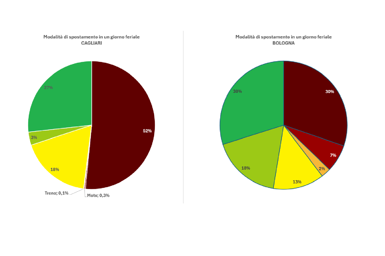 La percentuale di spostamenti a piedi è simile tra Cagliari (27%) e Bologna (30%). si registra però una differenza importante per gli spostamenti in auto che a Cagliari sono più della metà del totale (52%) mentre a Bologna si attestano al 30%. La motivazione è probabilmente da ricercare in un maggior utilizzo della bici da parte dei pollicini bolognesi che svolgono con questa modalità quasi 1 spostamento su 5 contro il 3% del campione di Cagliari.