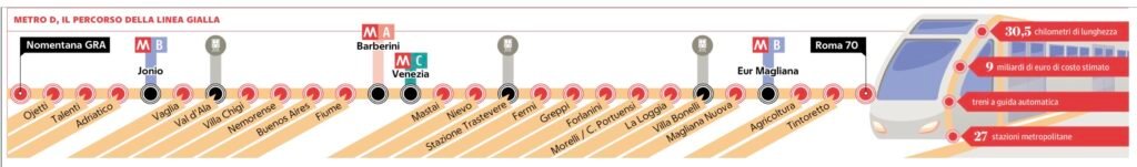 La linea D sarà identificata dal colore giallo, utilizzerà treni driverless e avrà due depositi in prossimità dei capolinea. Definito il progetto, si apre ora la partita dei finanziamenti: il costo complessivo supera i 9 miliardi di euro. Dopo la chiusura del documento di fattibilità delle alternative progettuali, il Comune valuterà se riattivare il precedente progetto in project financing o procedere con una nuova gara e la richiesta di fondi nazionali. Per l’avvio dei cantieri, comunque, serviranno ancora alcuni anni.