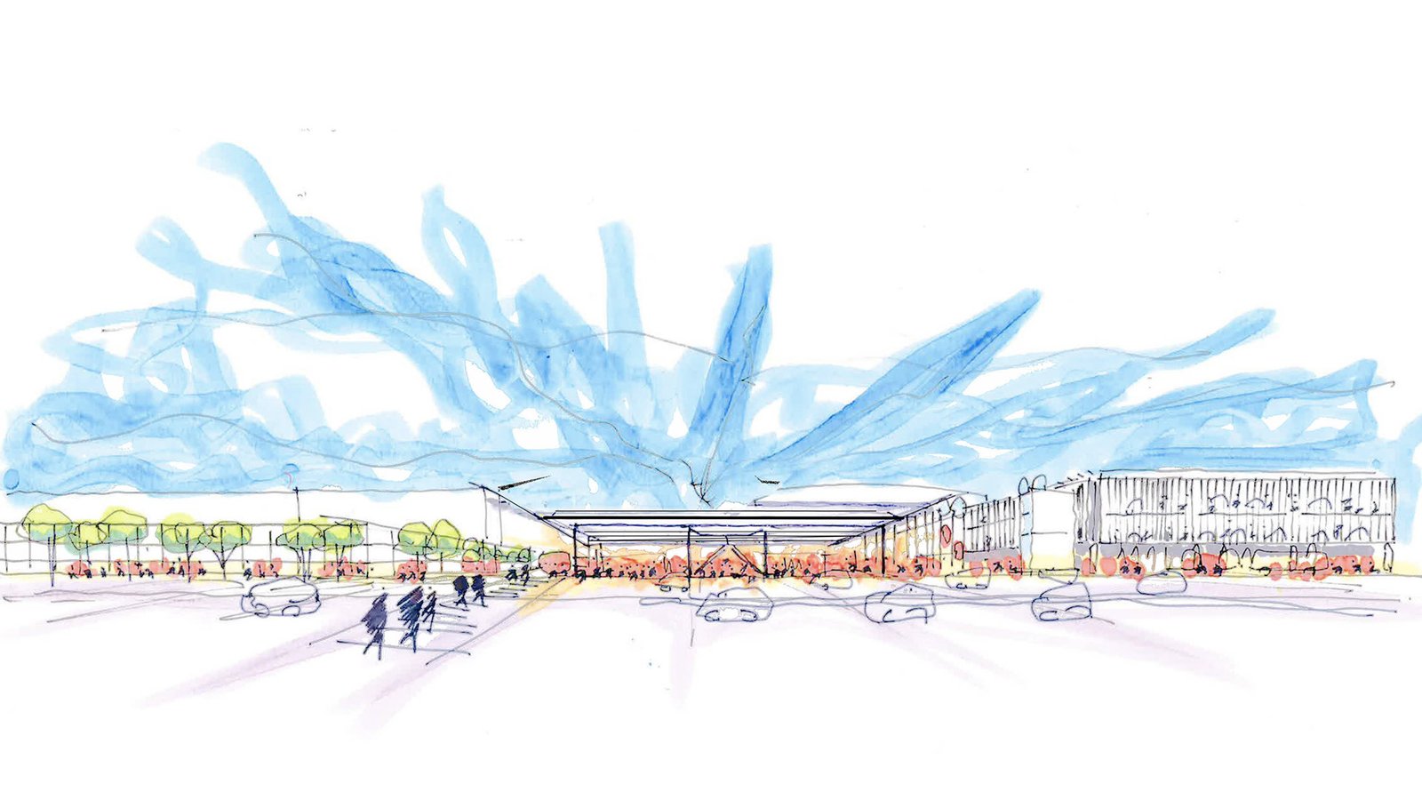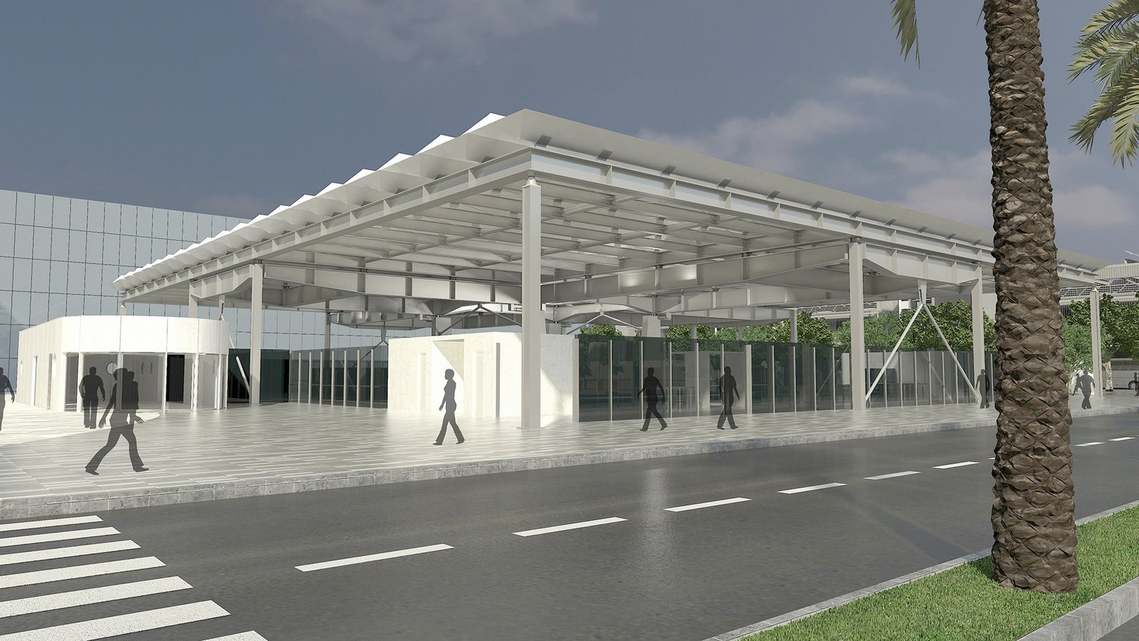 Alla fermata si accederà tramite un pozzo ellittico sotterraneo situato all’interno dell’aeroporto: otto grandi ascensori e delle scale mobili a spirale avranno il compito di portare i passeggeri nella stazione che, come dimostrano i rendering, sarà dallo stile modernista. La copertura sarà costituita da una tettoia quadrata in vetro e alluminio, così che la luce naturale possa penetrare nello spazio sotterraneo.