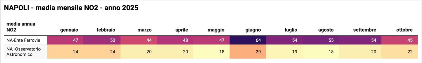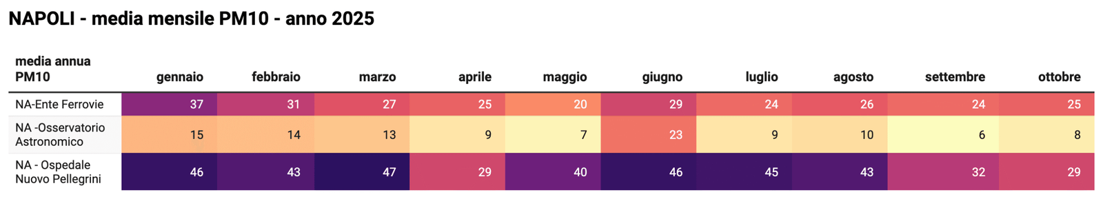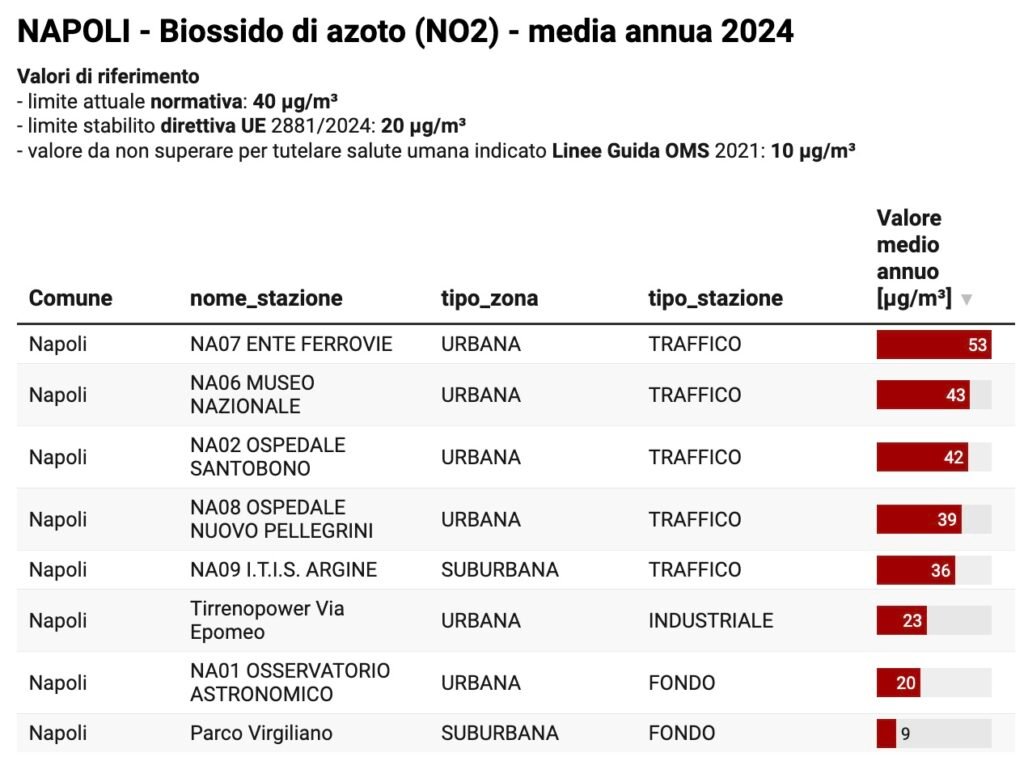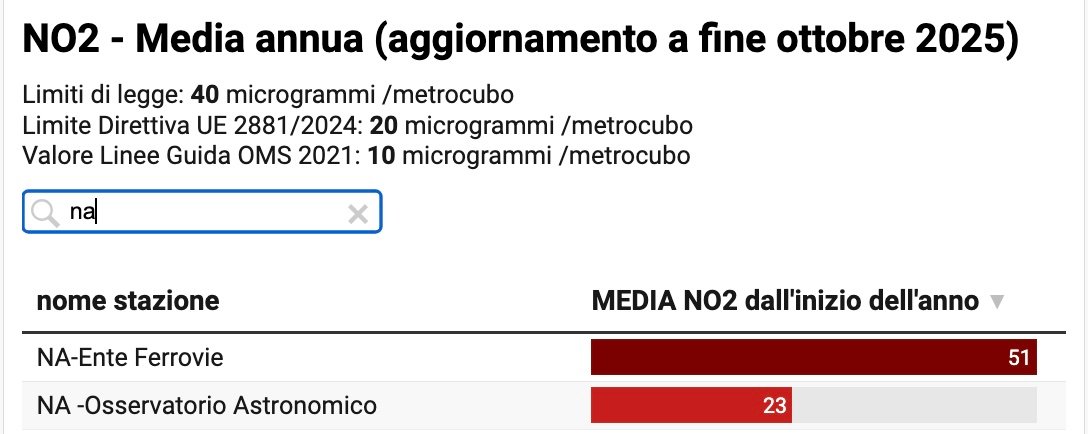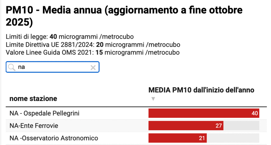 NA-Ente Ferrovie a fine ottobre 2025 registra una media annua di 51 microgrammi/metro cubo di aria (μg/m3) rispetto ad un limite stabilito dalla legge vigente di 40 μg/m3, che quasi sicuramente sarà superato, quindi, a fine 2025.