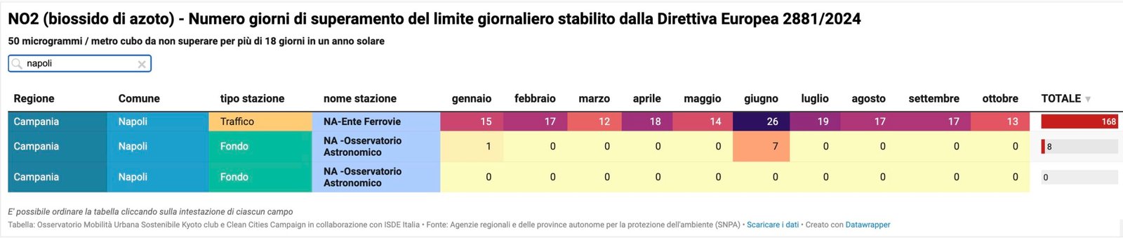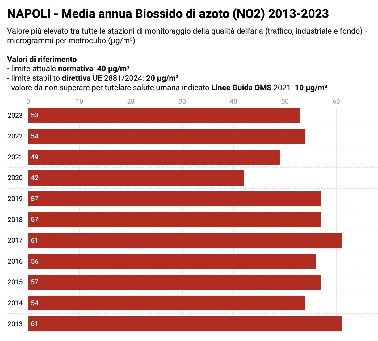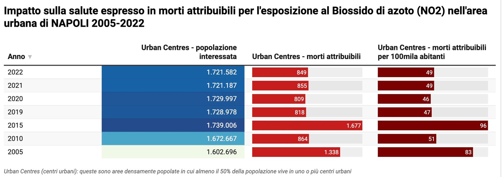 L’Agenzia Europea per l’Ambiente (EEA) ogni anno aggiorna le stime sulle morti premature attribuibili all’esposizione al biossido di azoto nelle città europee (non sono disponibili dati relativi al PM10, in quanto l’EEA per le polveri considera solo il PM2,5. Nella seguente tabella i dati relativi a Napoli.