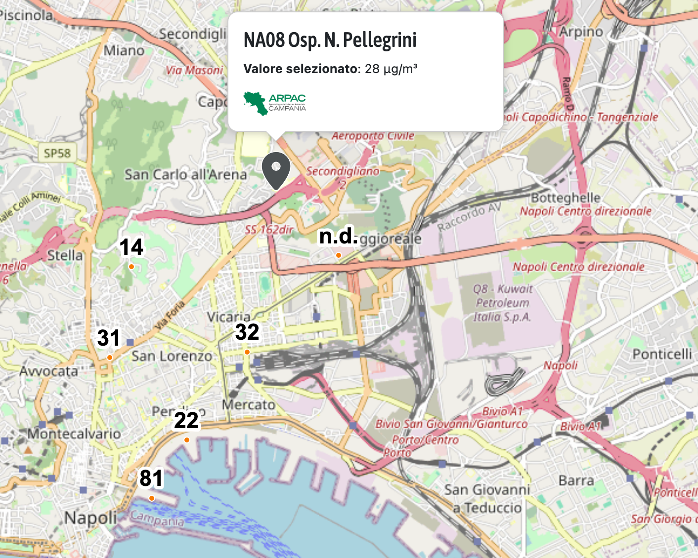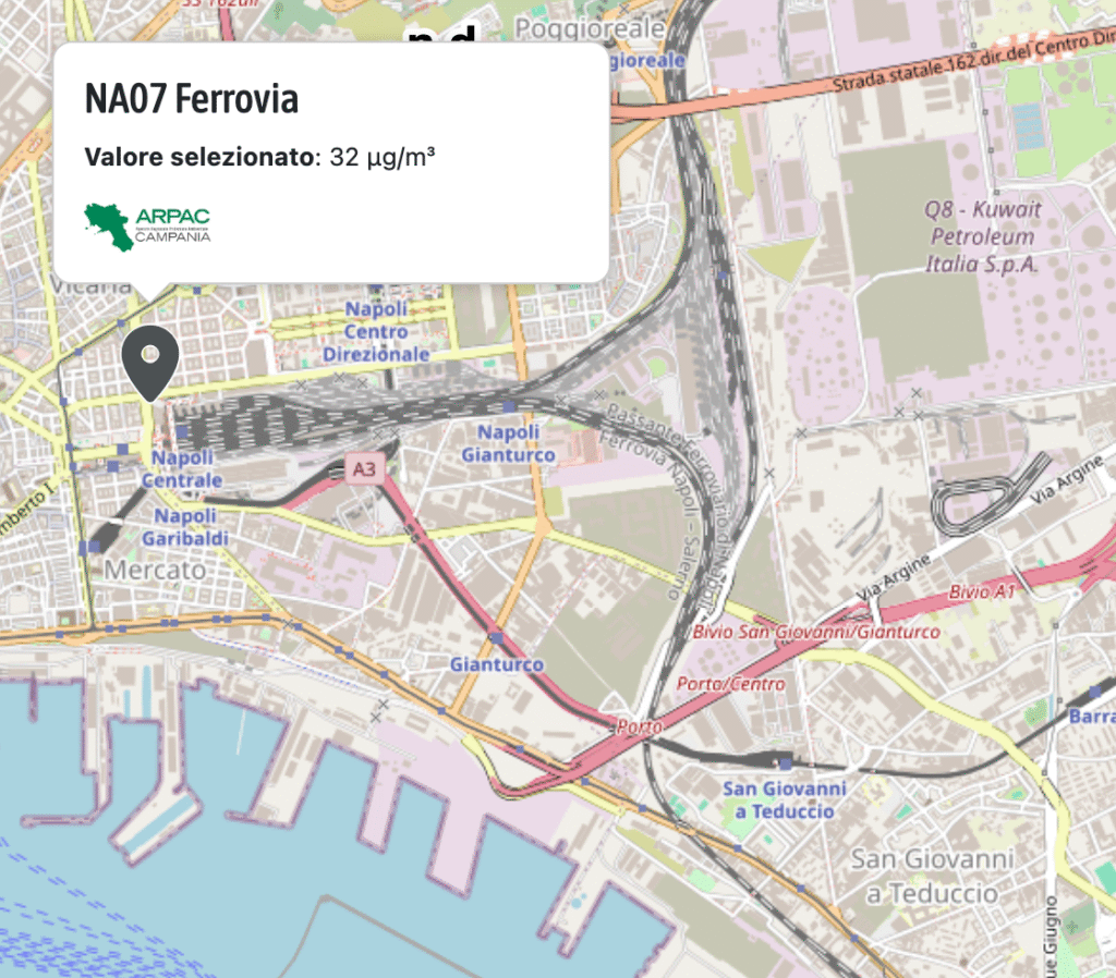 Presentando i dati aggiornati a fine ottobre della rilevazione effettuata sulla qualità dell’aria in 27 città italiane, attraverso i dati di 58 stazioni di monitoraggio, abbiamo evidenziato che a Napoli si trovavano le due centrali con i dati peggiori per quanto riguarda il PM10 e il Biossido di azoto (NO2). Si tratta delle stazioni di monitoraggio di ARPA Campania rispettivamente NA-Ospedale Pellegrini e NA-Ente Ferrovie, entrambe classificate come stazioni di traffico.