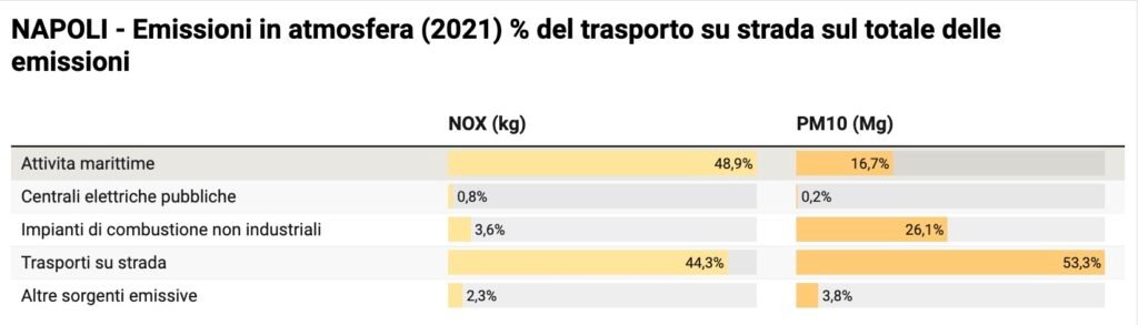 Per quanto riguarda le fonti emissive, Arpa Campania ha pubblicato l’Inventario Regionale delle Emissioni in Atmosfera (aggiornamento 2021) che evidenzia come gli ossidi di azoto siano per il 44% derivanti dalla combustione dei veicoli alimentati con combustibili fossili, mentre per il 49% dalle attività portuali. Per il PM10 il contributo del trasporto stradale è ancora più elevato (53%) seguito dagli impianti di riscaldamento (26%).