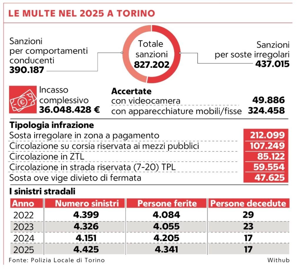 Nel 2025 a Torino la violazione più frequente resta la sosta irregolare: 437 mila multe su 827.202 complessive, oltre la metà del totale, pari a circa 1.200 verbali al giorno. La voce più consistente riguarda la sosta sulle strisce blu senza ticket o oltre il tempo consentito (212.099 sanzioni), seguita dalle soste in divieto di fermata (47.625). Quasi 50 mila infrazioni sono state accertate con videocamere.