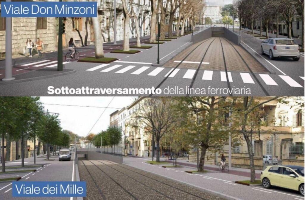 Il capitolo cantieri resta uno dei più delicati. Il contratto con l’impresa prevede una durata dei lavori di 34 mesi, ridotta rispetto ai 42 inizialmente previsti, grazie a un meccanismo di premio per l’accelerazione. Il nodo tecnico più complesso sarà il sottopasso tramviario tra viale Don Minzoni e viale dei Mille, sotto la linea ferroviaria: un intervento che durerà circa mille giorni e richiederà una lunga fase con il cavalcavia delle Cure ridotto a una sola corsia, pur senza interrompere il traffico ferroviario, grazie a importanti lavori di rinforzo dei binari in superficie.