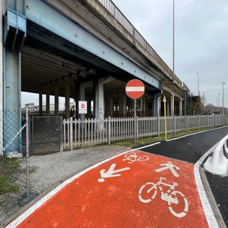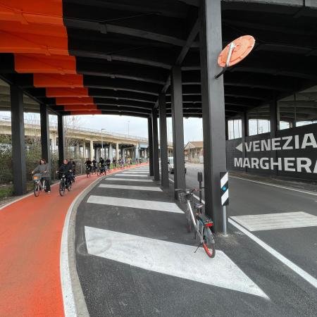 Un progetto che ha portato l’incremento della mobilità in città nell’area industriale di Marghera attraverso la realizzazione di nuovi attraversamenti percorribili in sicurezza e in grado di connettere tra loro la Città giardino, la nuova piscina comunale di via delle Macchine, il Parco Scientifico Tecnologico Vega e la preesistente pista ciclabile di collegamento alla città di Venezia.
