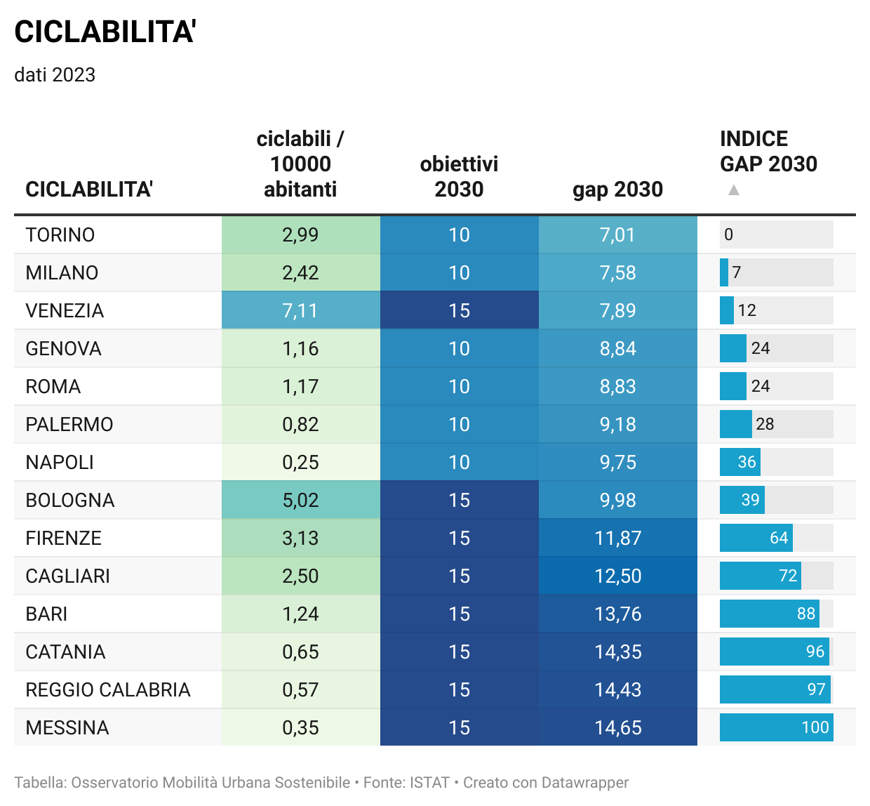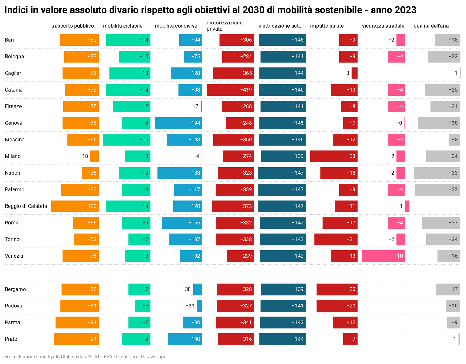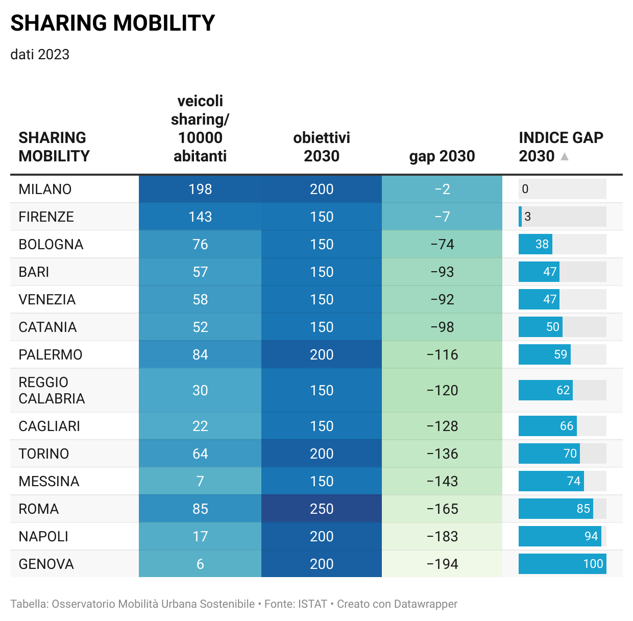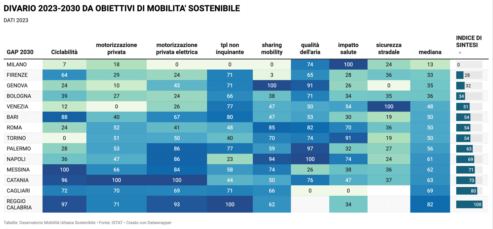 Nella pagina Osservatorio della mobilità sostenibile nelle grandi città italiane sono disponibili tutti i dati per singola città e comparati fra di loro, oltre agli aggiornamenti quotidiani sulla situazione, nonchè i grafici relativi al "Divario" per ciascuna città in relazione agli indicatori considerati in base alla metodologia aggiornata (vedi Mobilitaria 2025).