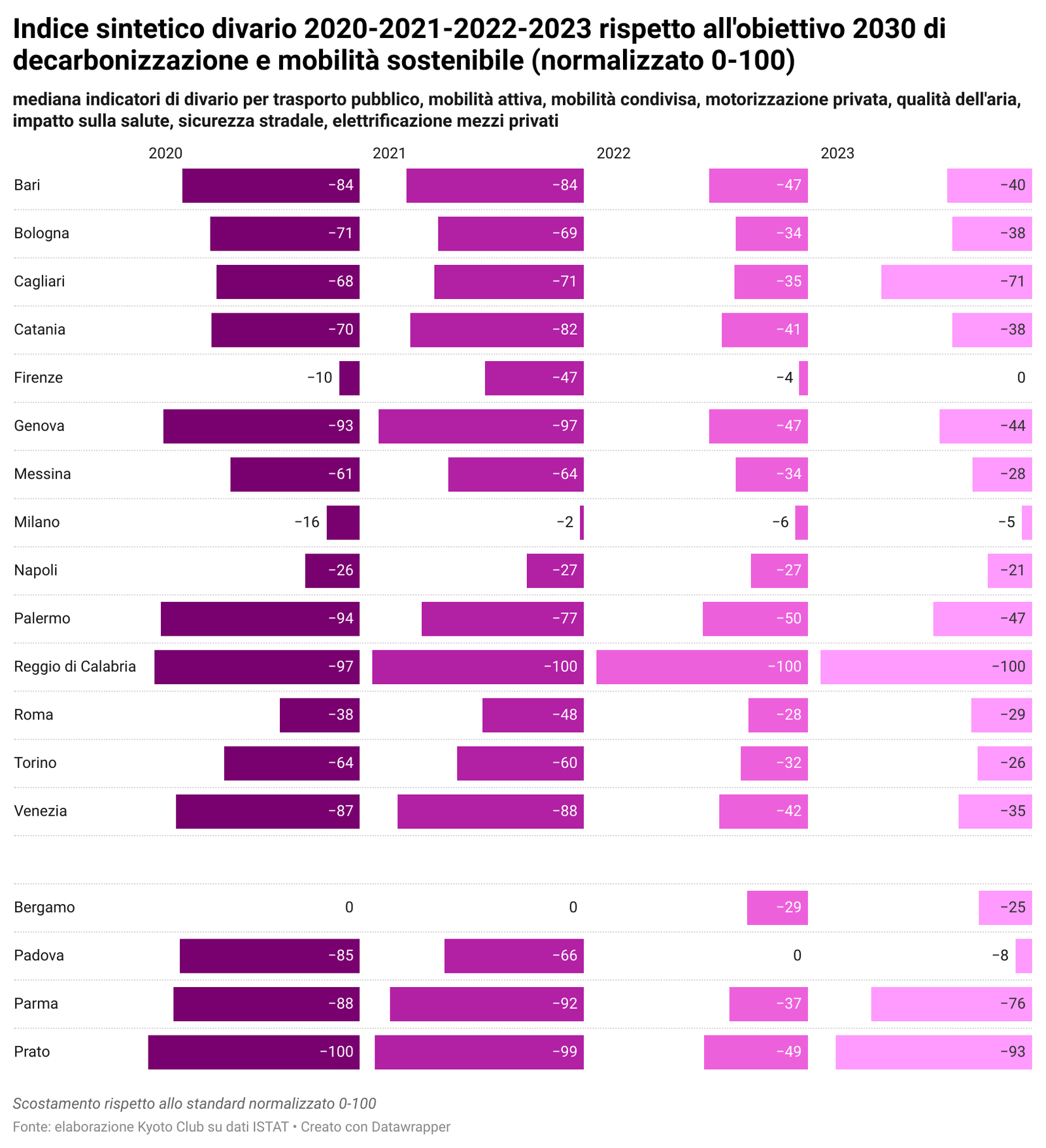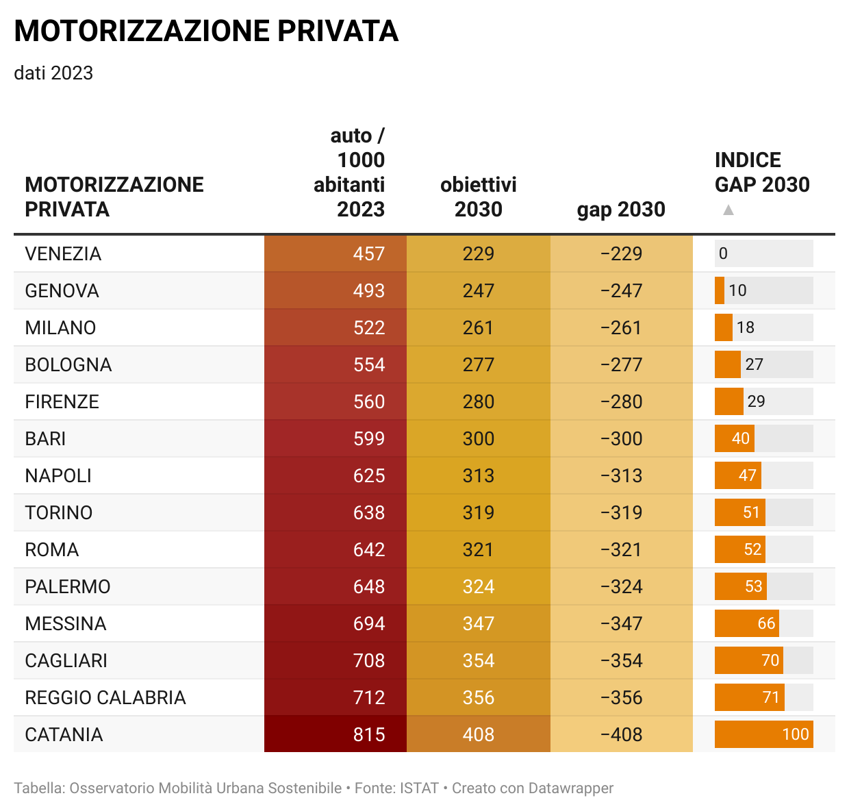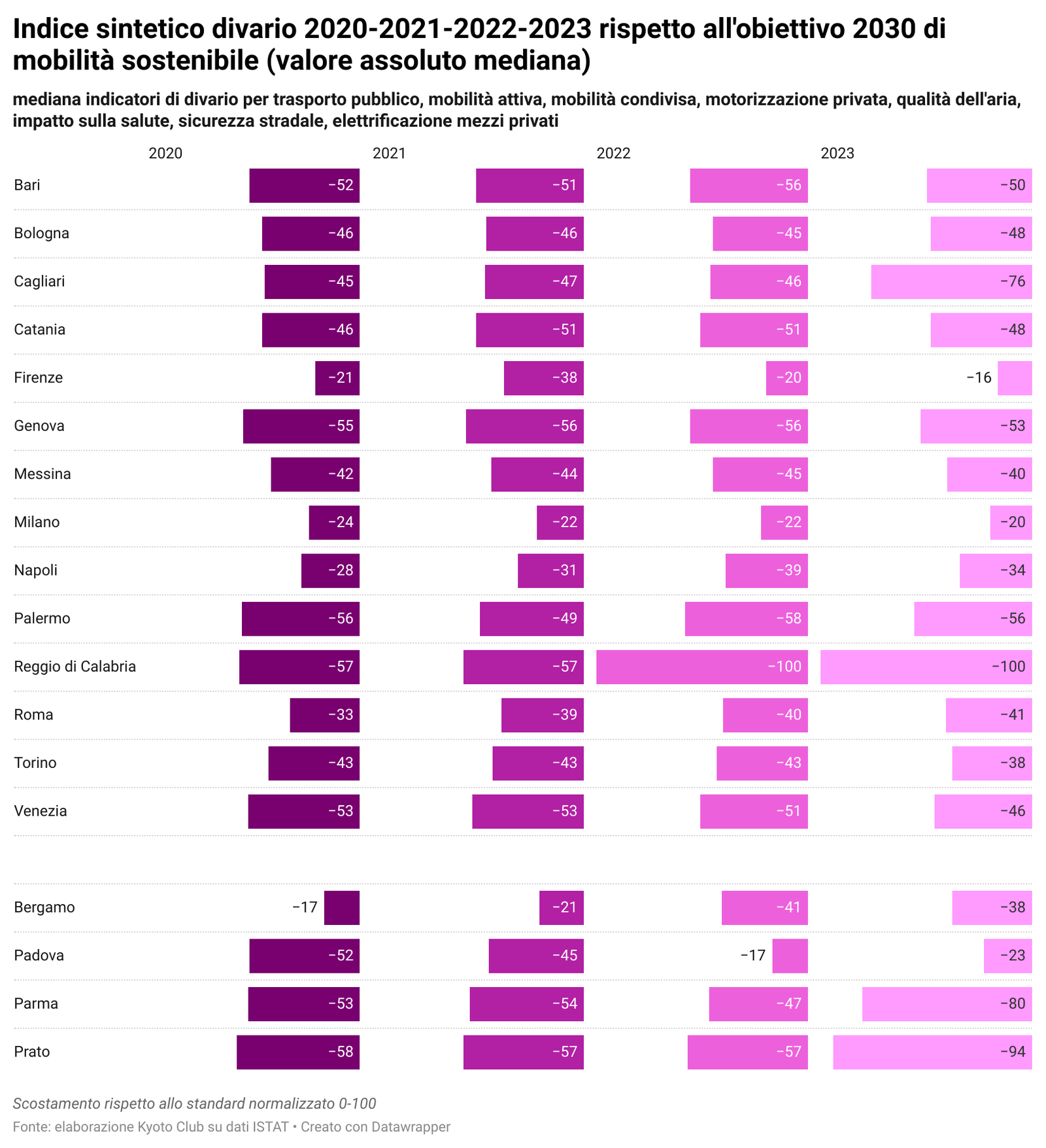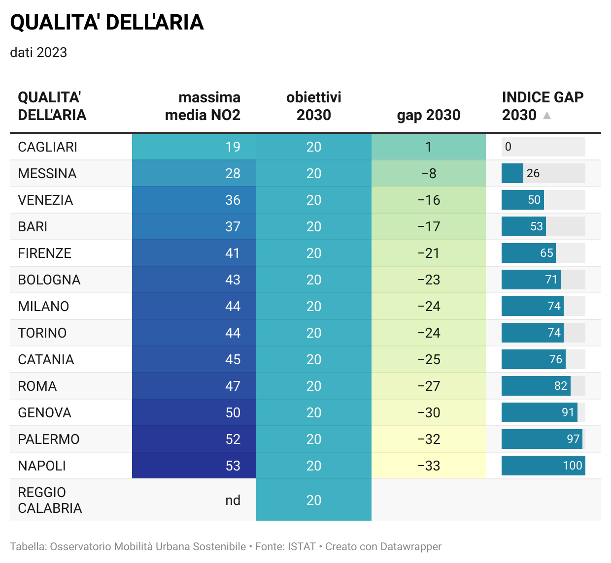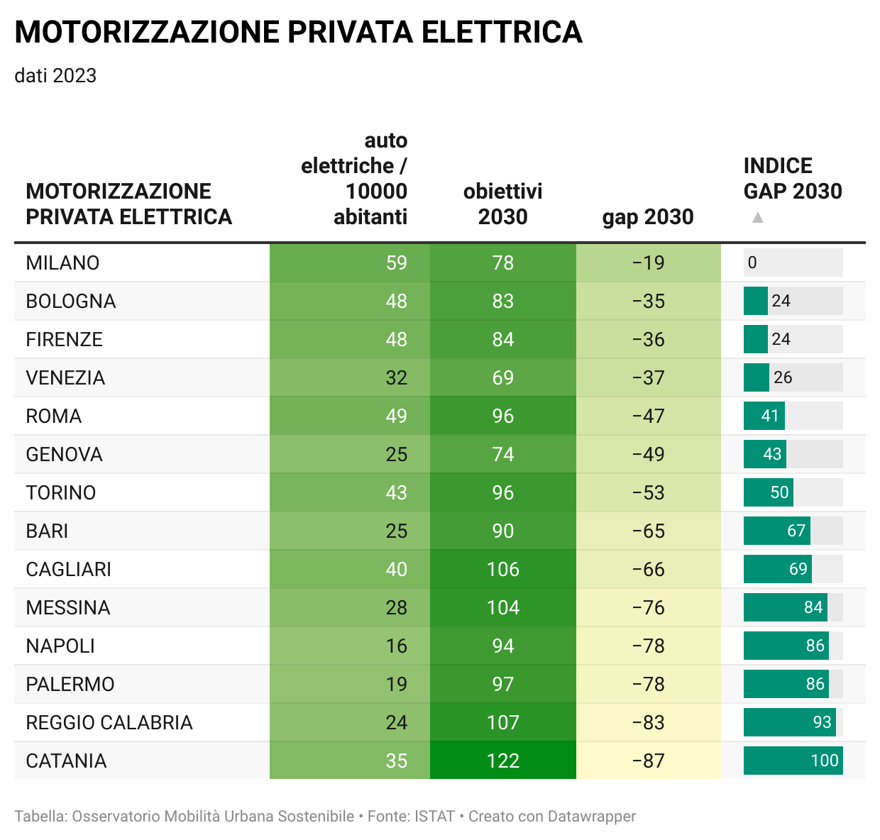 Nella pagina Osservatorio della mobilità sostenibile nelle grandi città italiane sono disponibili tutti i dati per singola città e comparati fra di loro, oltre agli aggiornamenti quotidiani sulla situazione, nonchè i grafici relativi al "Divario" per ciascuna città in relazione agli indicatori considerati in base alla metodologia aggiornata (vedi Mobilitaria 2025).