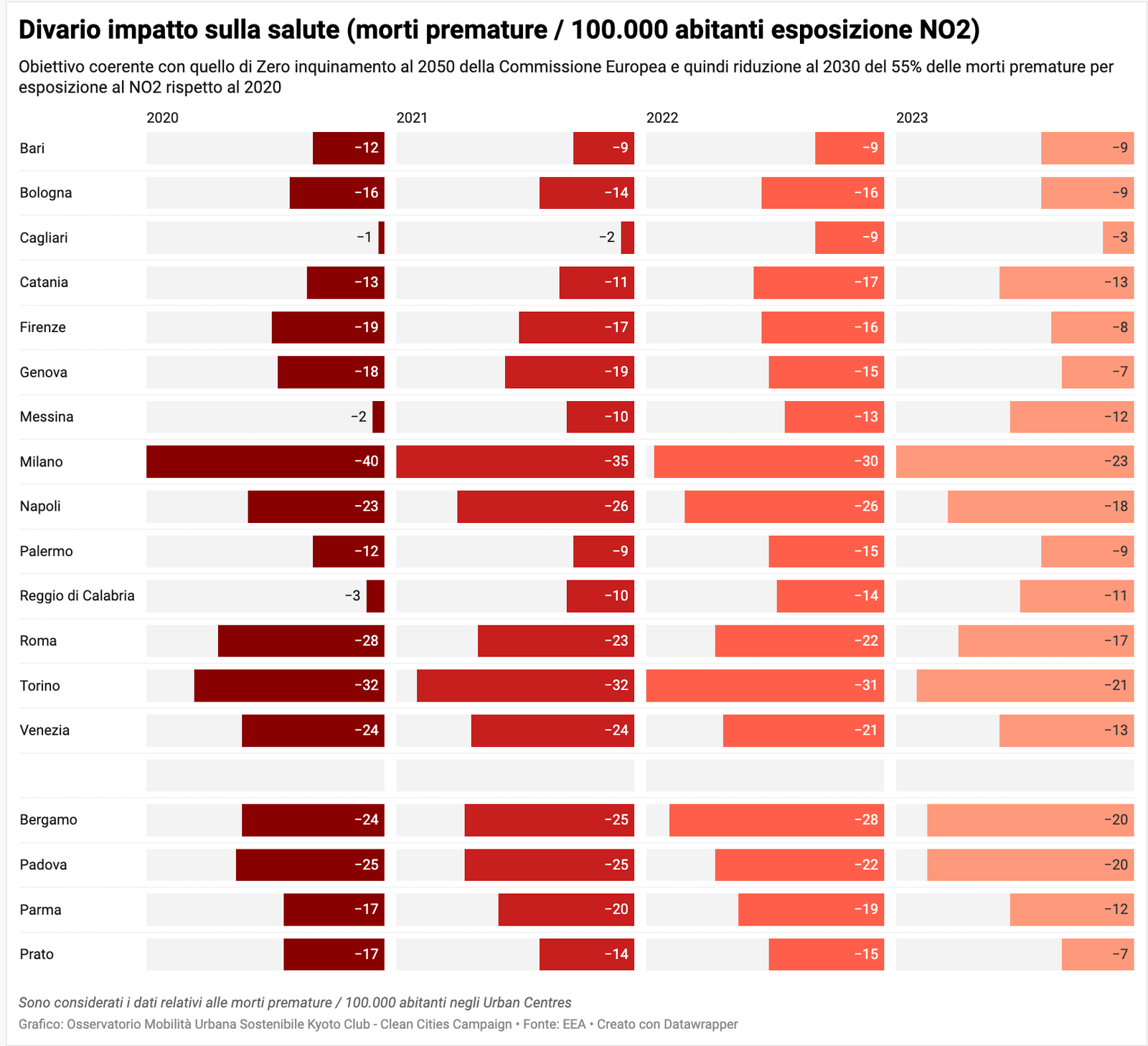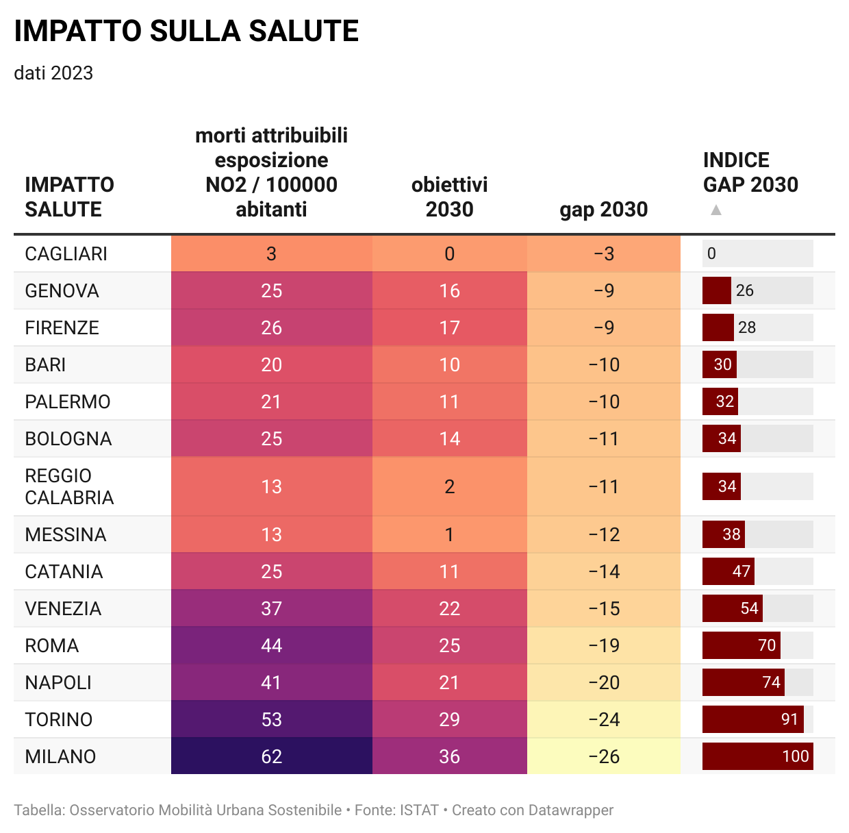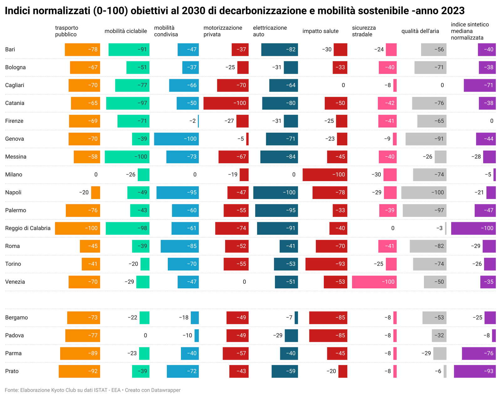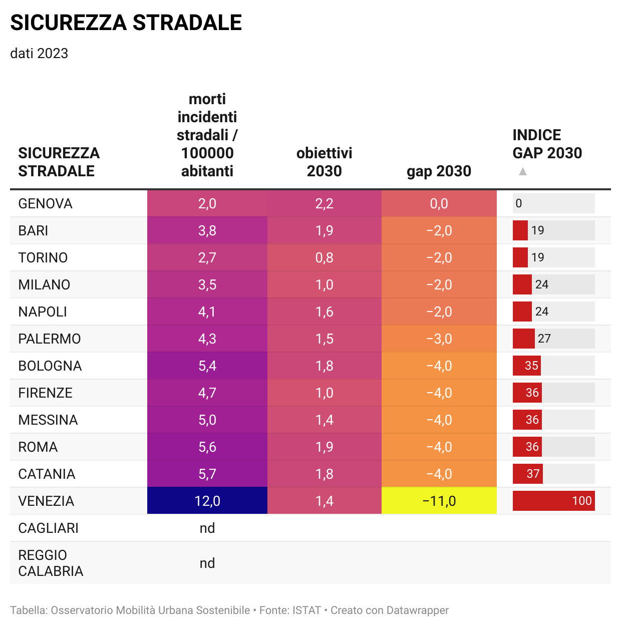 Nella pagina Osservatorio della mobilità sostenibile nelle grandi città italiane sono disponibili tutti i dati per singola città e comparati fra di loro, oltre agli aggiornamenti quotidiani sulla situazione, nonchè i grafici relativi al "Divario" per ciascuna città in relazione agli indicatori considerati in base alla metodologia aggiornata (vedi Mobilitaria 2025).