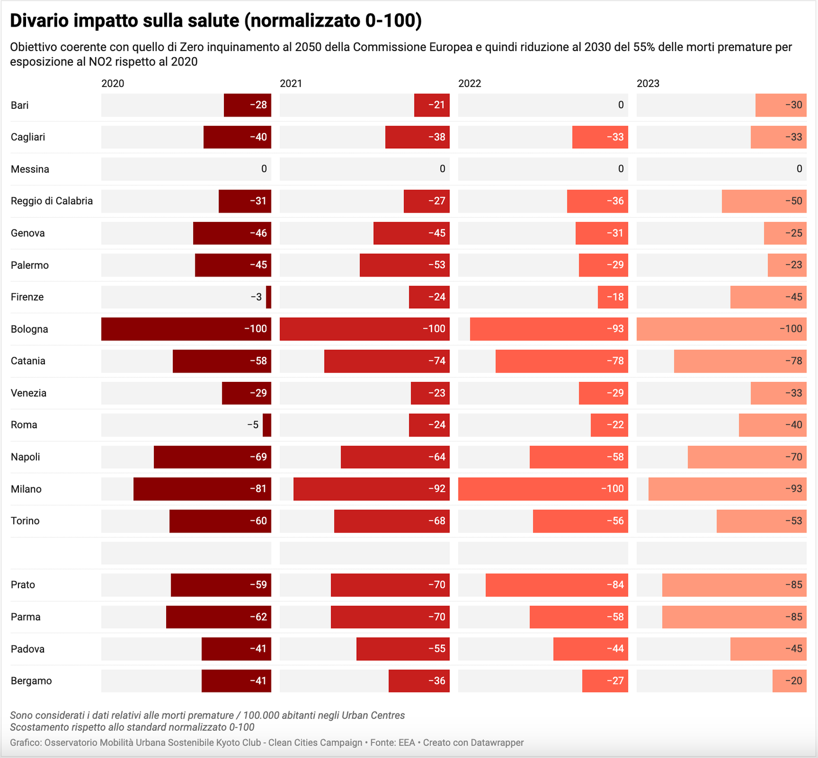 Nel 2023 abbiamo analizzato in particolare i comuni capoluogo di città metropolitana: Bari, Bologna, Cagliari, Catania, Firenze, Genova, Messina, Milano, Napoli, Palermo, Reggio Calabria, Roma, Torino e Venezia. Dal 2024 sono stati analizzati anche i comuni di Bergamo, Padova, Parma e Prato.