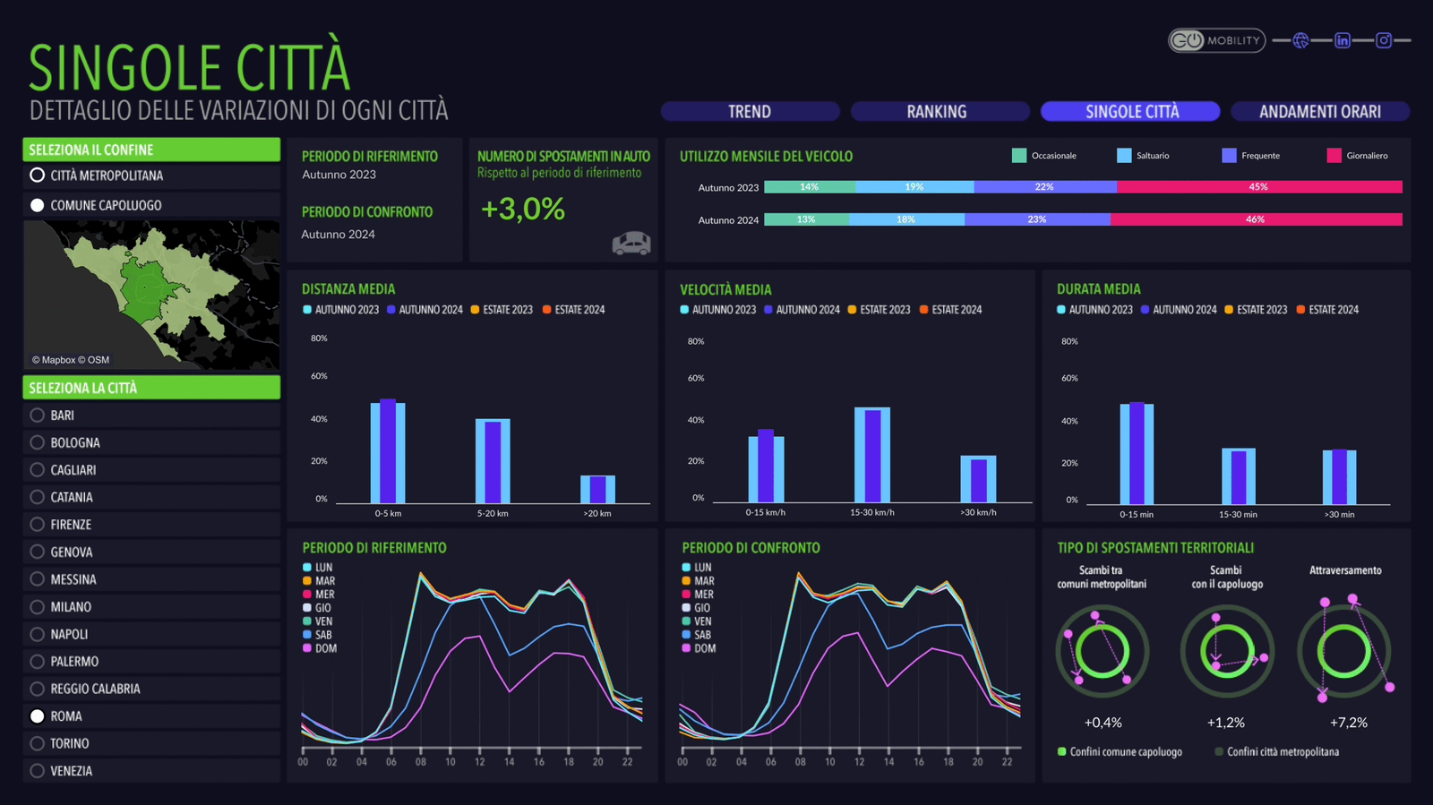 In questa pagina sono disponibili i dati sulla mobilità della città confrontati nel tempo e le notizie, aggiornate quotidianamente, sulle novità relative a trasporto pubblico, mobilità attiva, mobilità condivisa ed elettrica, regolazione del trasporto privato.